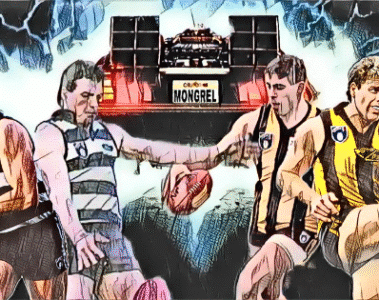 Adrian Hickmott caught a glimpse of Silvagni running forward as he made a U-turn in the middle and chipped the footy toward him. It was just a bit too long for SoS to mark, but he was putting in the big ones to make the ground. Silvagni kept his eyes on the footy – he would never dream of doing anything else, but coming the other way with a head of steam, having seen the play unfold, was Milburn.